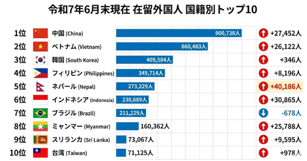 日本に暮らす外国人の出身国を見ると、その多様性の広がりがよく分かります。2025年6月末時点で、在留外国人の国籍別構成は以下のようになっています(出入国在留管理庁調べ):
