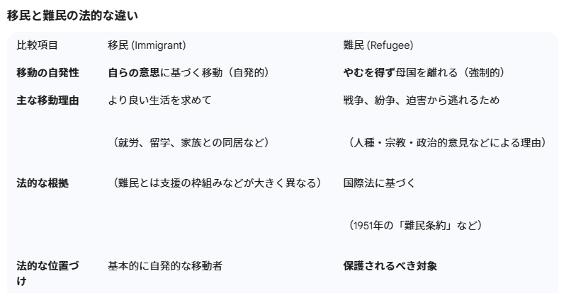 難民は、1951年の「難民の地位に関する条約(難民条約)」などの国際法に基づいて、保護されるべき対象として法的に位置づけられています。一方、移民は基本的に自発的な移動であり、法的な扱いや支援の枠組みは難民とは大きく異なります。