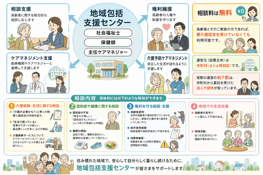 - 総合相談支援業務: 介護だけでなく、福祉、保健、医療など多角的な視点から高齢者の相談に応じ、適切なサービスへ繋ぐ窓口。